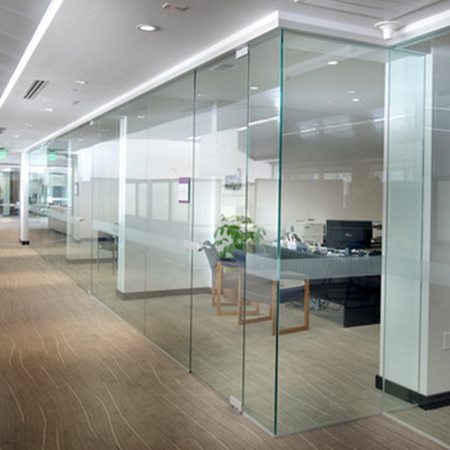 Partisi kaca ruangan yang lebih lega dibuat dengan keseluruhan dinding kaca tanpa adanya bingkai / frameless. Proses pemasangan menggunakan teknik U tanam agar dapat meningkatkan ketahan kaca.